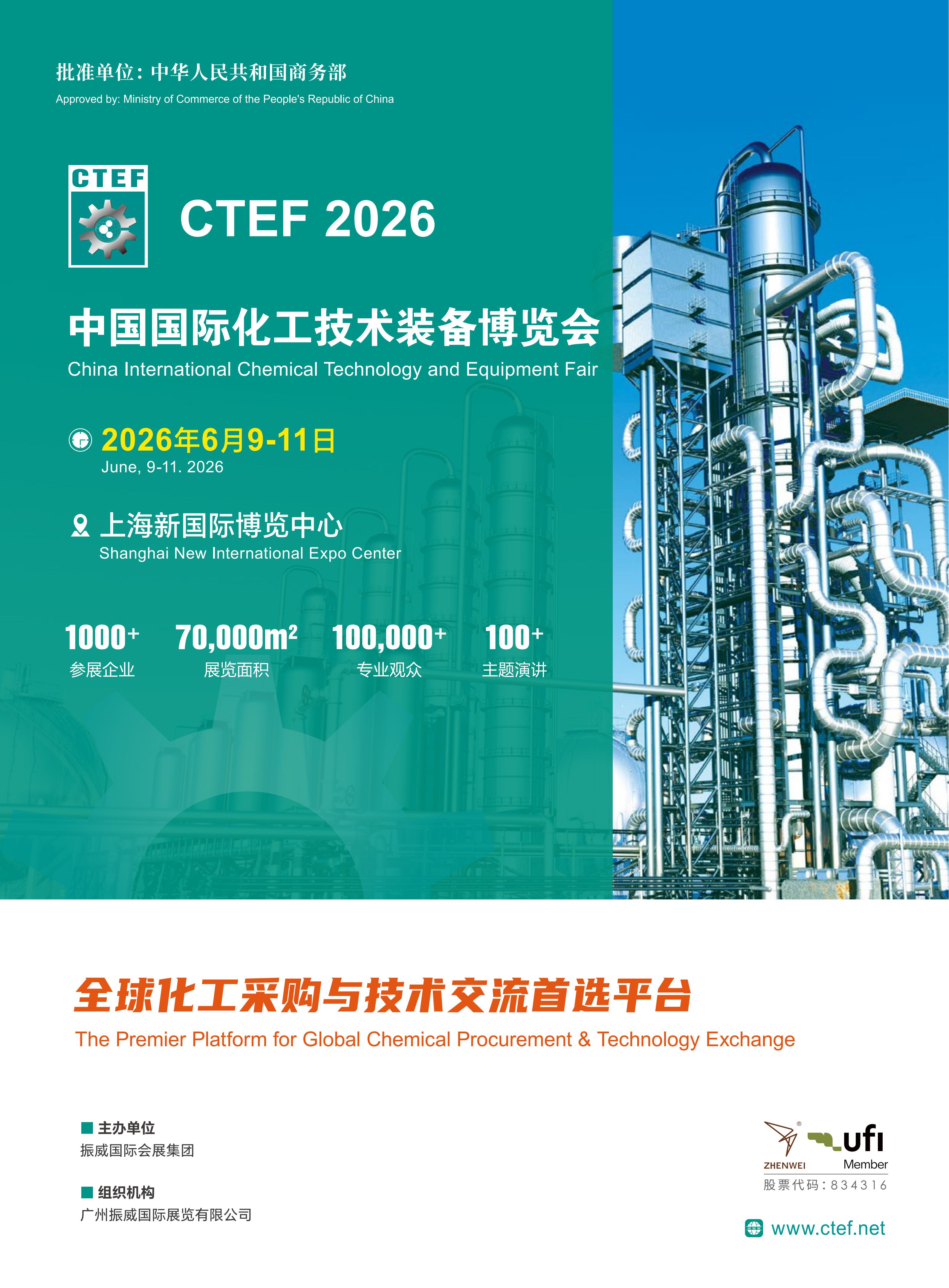 CTEF 2026将于2026年6月9-11日在上海新国际博览中心举办,展会是由振威国际会展集团主办。重点规划化工核心工艺设备与单元**作、化工设备特种材料及防腐蚀、化工过程安全与防爆技术装备、流体输送设备、智慧化工与数字化转型、仪器仪表及自动化系统、化工工艺研发与分析、化工环保技术设备八大板块。